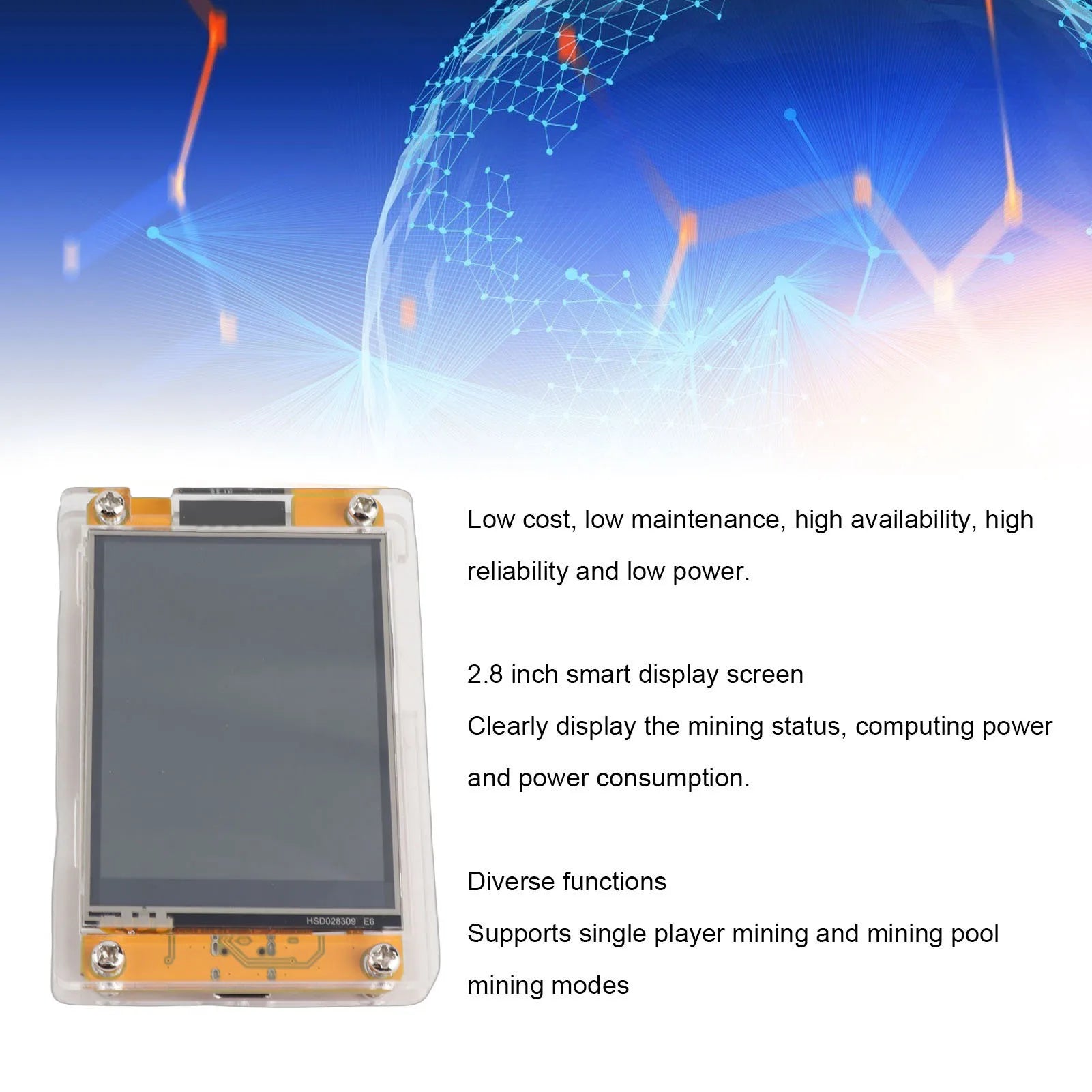 3. Visual Interface: This miner is equipped with an support for ESP32 S3R8 MCU WiFi microcontroller and a 2.8 inch smart display, which clearly shows mining status, as well as related information such as computing power and power consumption. Efficient feedback facilitates observing of mining performance and improves operational convenience.