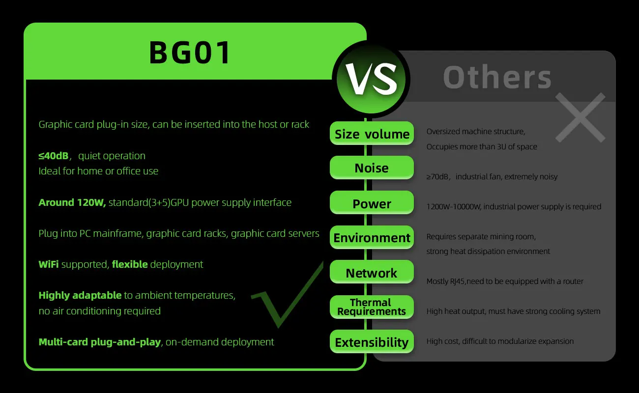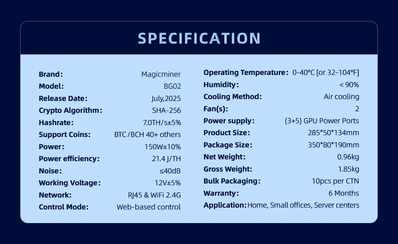 Magicminer Home-Grade SOLO Miner Series is designed for users seeking quiet mining in homes, studios, or offices. Offering two models—BG01 (4.5 TH/s, 120W) and BG02 (7.0 TH/s, 150W)—to meet varying hashrate demands and budgets, both support multi-currency mining including BTC and BCH. Truly plug-and-mine, energy-efficient, and stable.