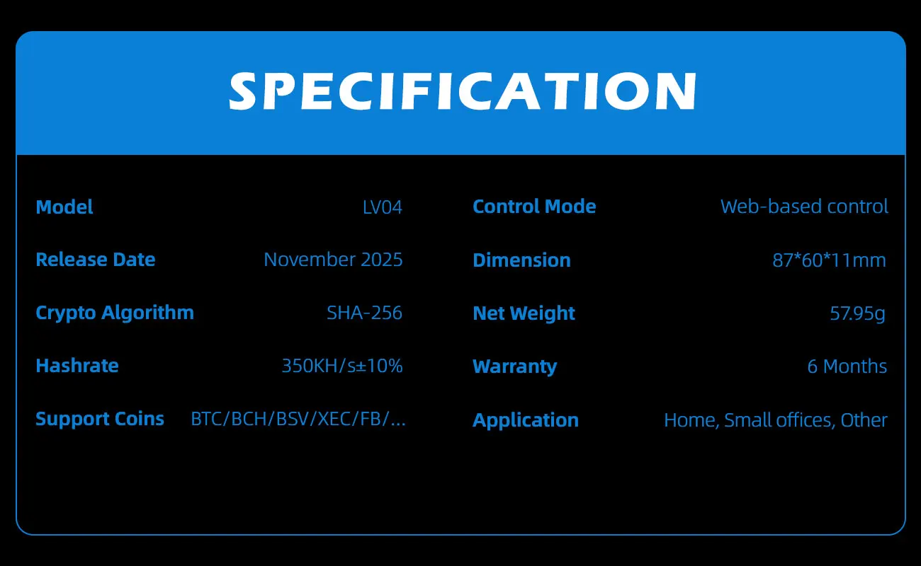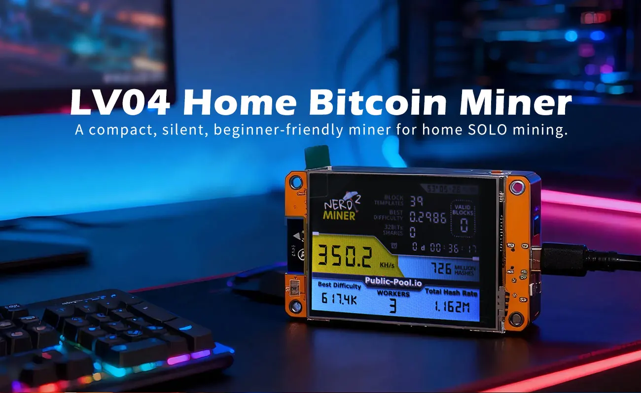 Lucky Miner LV04 is a compact Bitcoin miner designed for home and small desktop environments.With improved performance compared to entry-level USB miners, LV04 delivers higher hashrate while maintaining low power consumption and quiet operation.LV04 is especially suitable for users who want to explore Bitcoin SOLO mining with better stability and performance, without using large or professional mining equipment.
