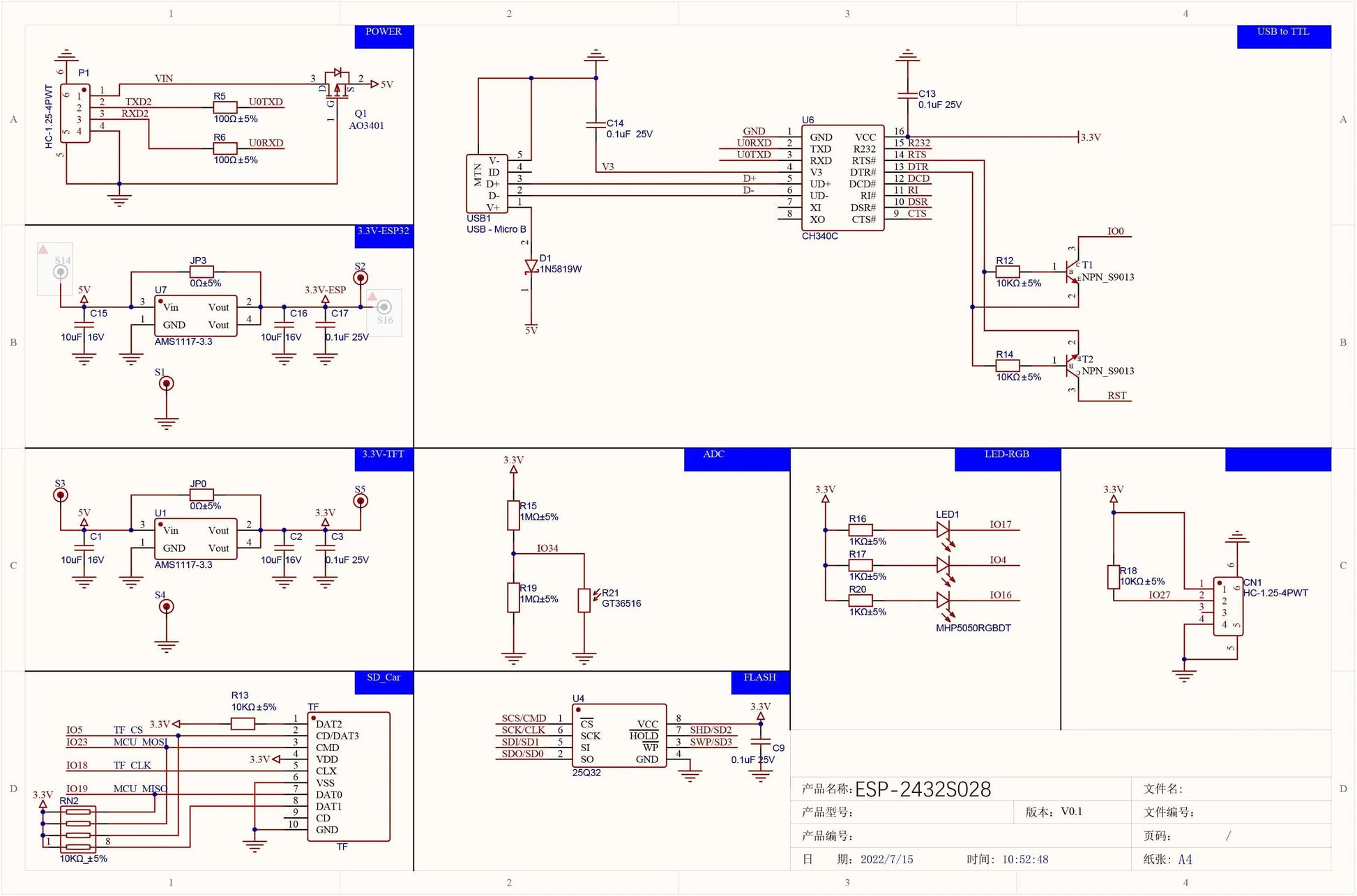 This LCD module uses ESP32-WROOM-32 module as the main control, the main control is a dual-core MCU, integrated WI-FI and Blue-tooth functions, the main frequency can reach 240MHz, 520KB SRAM, 448KB ROM, Flash size is 4MB+4MB, The display resolution is240x320 ,resistive touch. The module includes LCD display screen, backlight control circuit, touch screen control circuit, speaker drive circuit, photo sensitive circuit and RGB-LED control circuit. TF-card interface, serial interface, temperature and humidity sensor interface (DHT11 interface) and reserved IO port interface, this module supports development in Arduino-IDE, ESP IDE,Micropy-thon and Mi-xly.