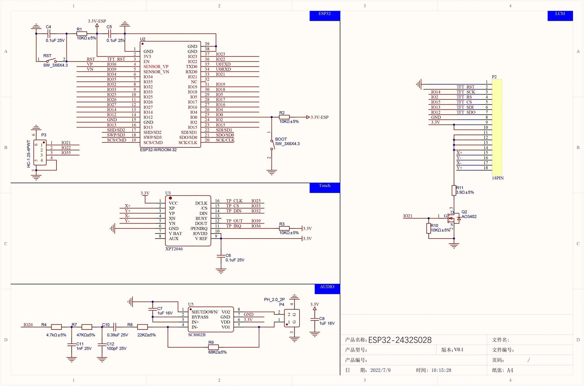 This LCD module uses ESP32-WROOM-32 module as the main control, the main control is a dual-core MCU, integrated WI-FI and Blue-tooth functions, the main frequency can reach 240MHz, 520KB SRAM, 448KB ROM, Flash size is 4MB+4MB, The display resolution is240x320 ,resistive touch. The module includes LCD display screen, backlight control circuit, touch screen control circuit, speaker drive circuit, photo sensitive circuit and RGB-LED control circuit. TF-card interface, serial interface, temperature and humidity sensor interface (DHT11 interface) and reserved IO port interface, this module supports development in Arduino-IDE, ESP IDE,Micropy-thon and Mi-xly.